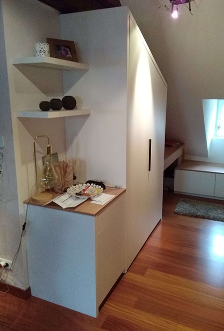 - Création et pose de meubles sur mesure à des fins d’aménagement : meubles de cuisine, meubles de salle de bains, meubles de sous-pentes (dans les combles), meubles sous escaliers, dressings, etc.